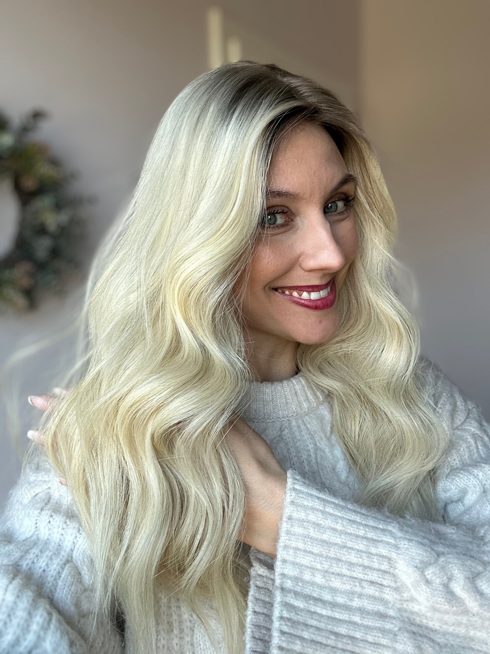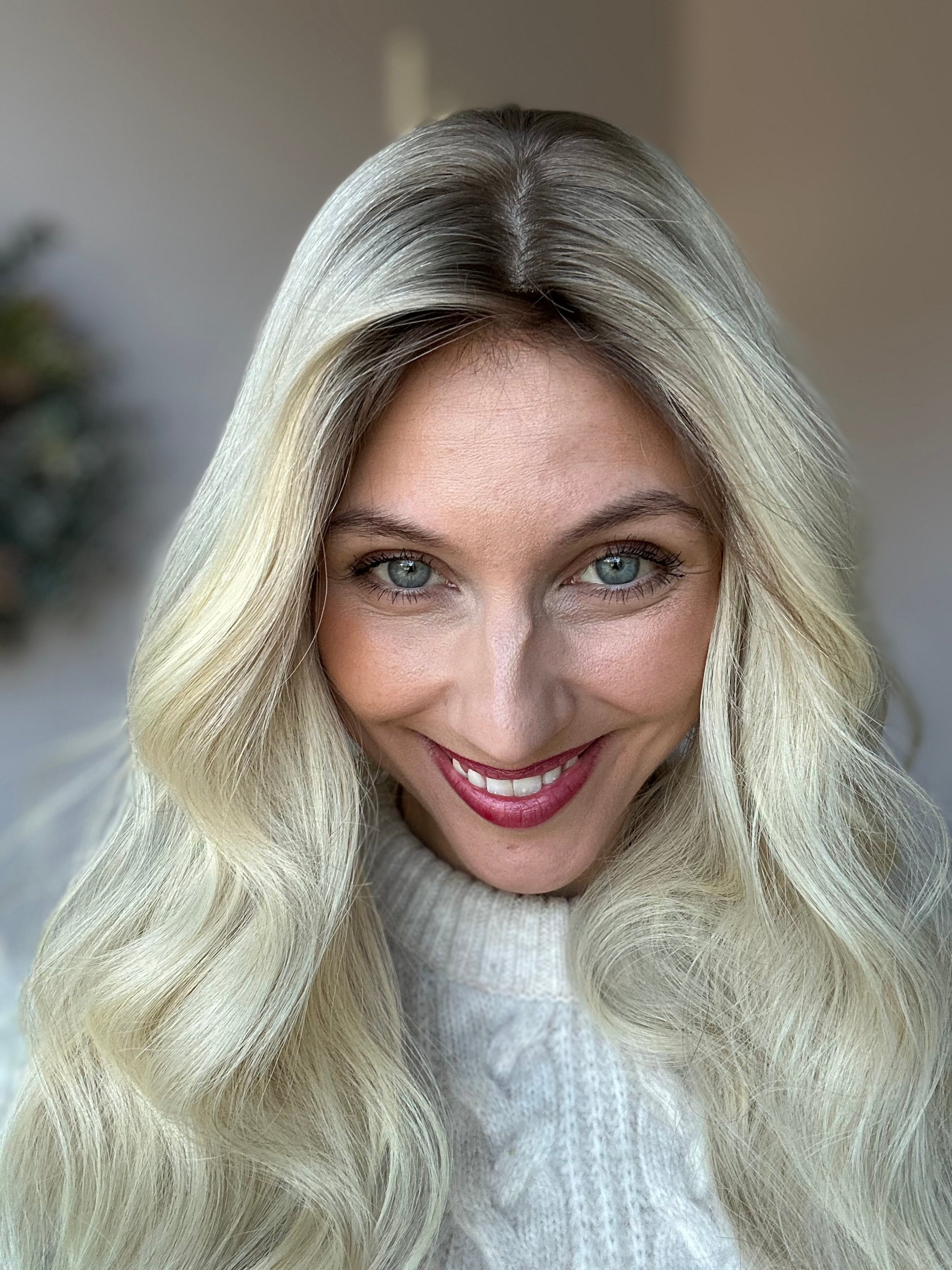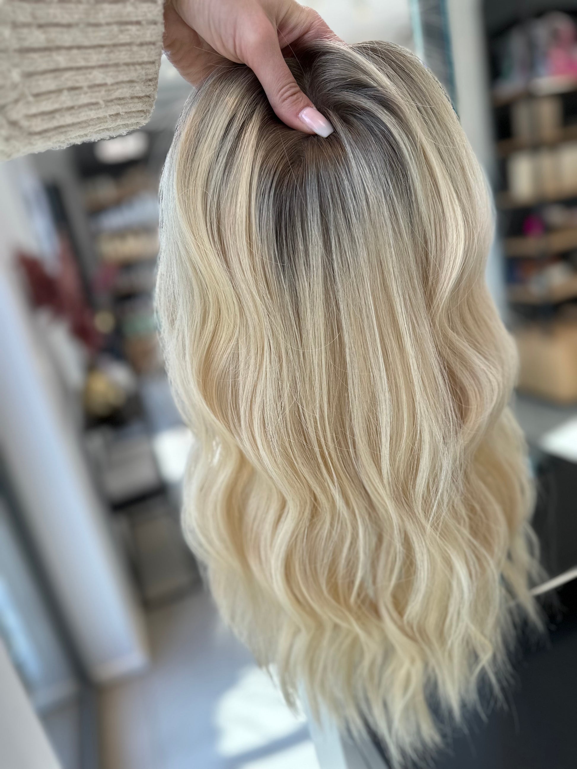 Ein raffinierter Look mit einem aschigen Ansatz und hellblonden Längen, der für eine zeitlose Eleganz steht. Hierbei wird die dunklere aschige Nuance am Ansatz sanft in die strahlenden hellblonden Längen übergeleitet. Der aschige Ansatz verleiht dem Haar eine natürliche Tiefe, während die hellblonden Längen für strahlende Helligkeit und Lebendigkeit sorgen.