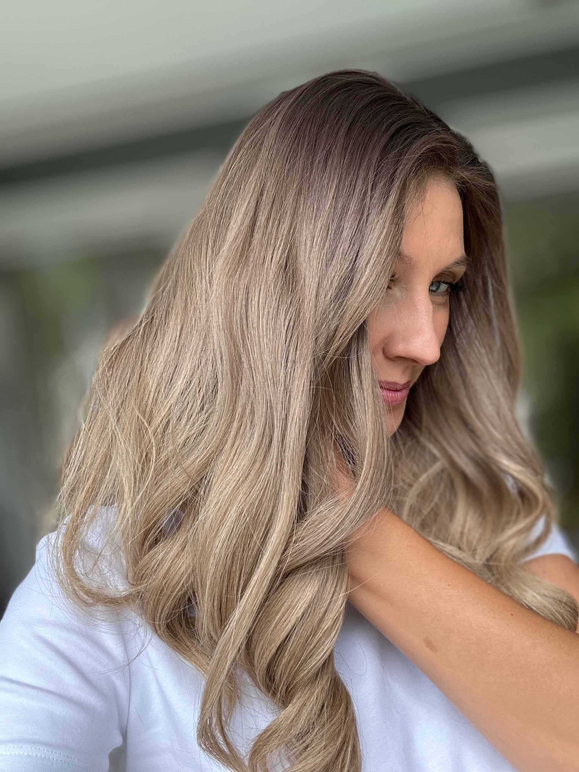 Die aschblonden Längen lassen dieses Unikat frisch und strahlend wirken.