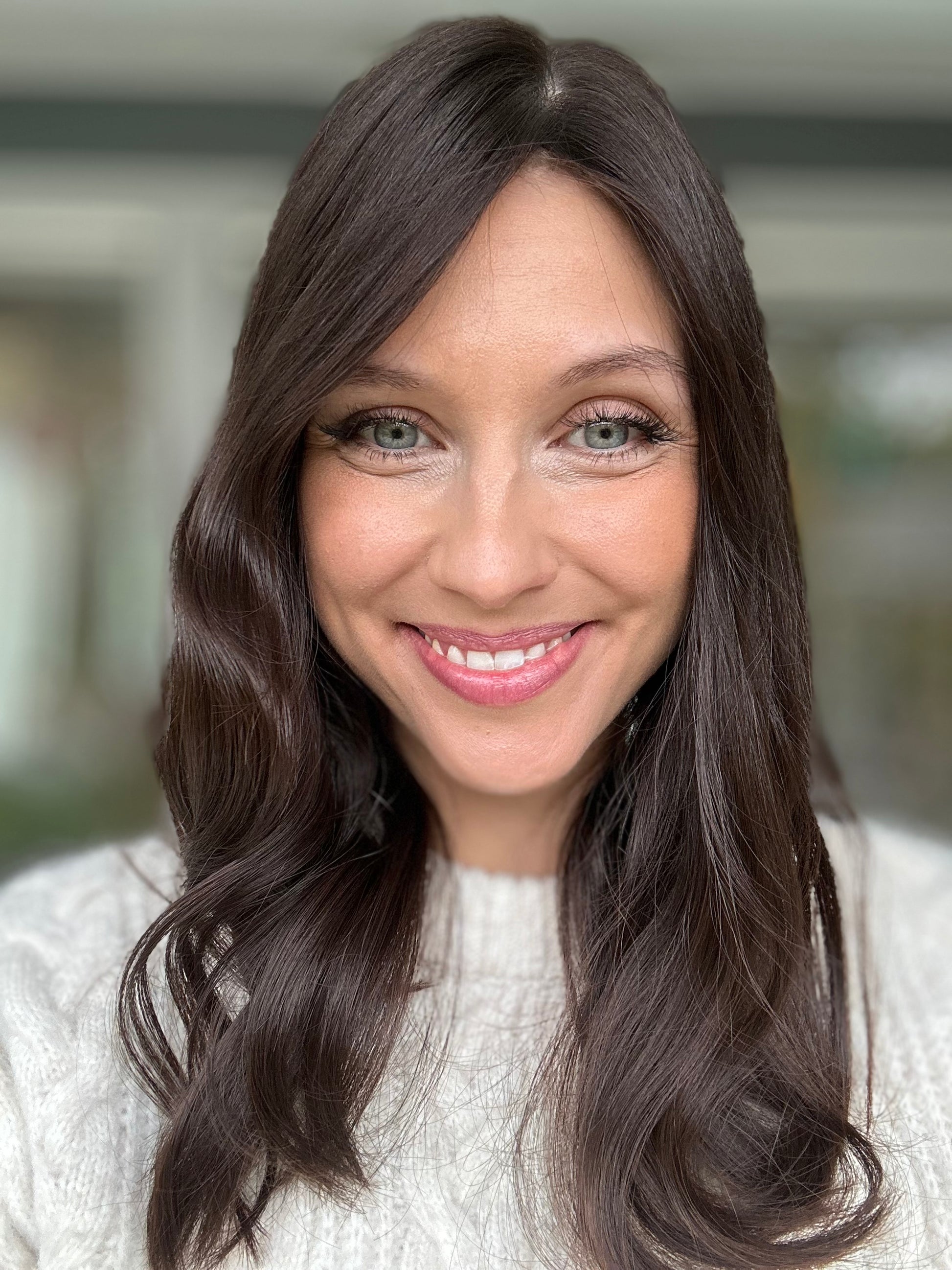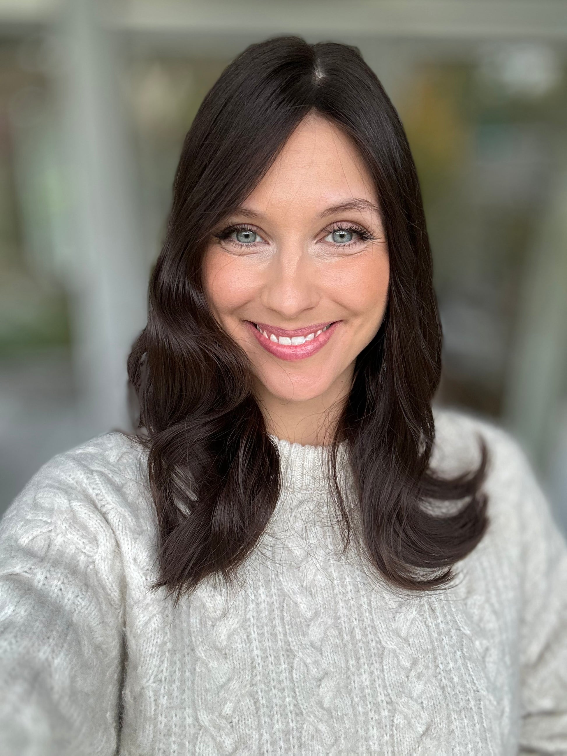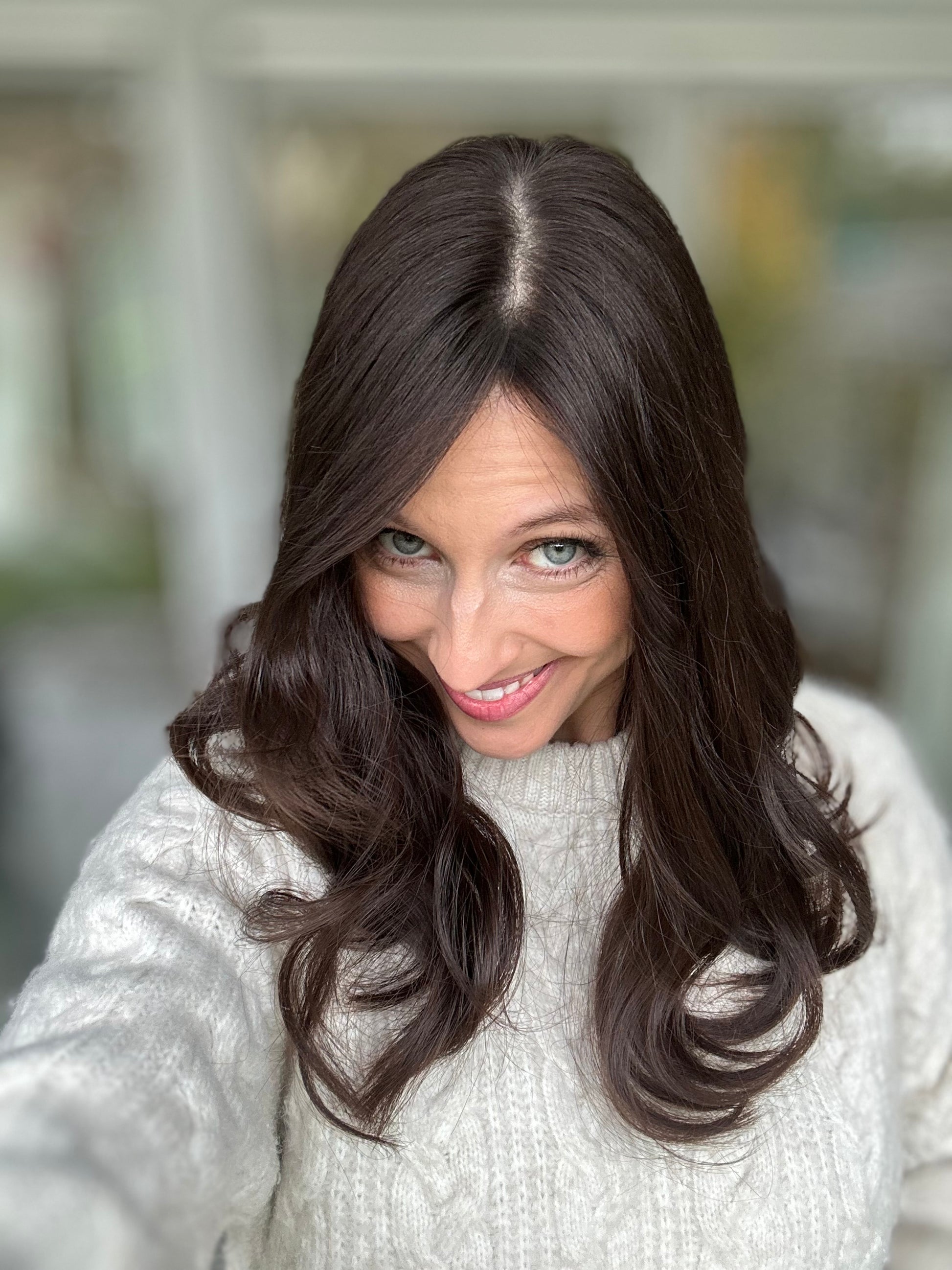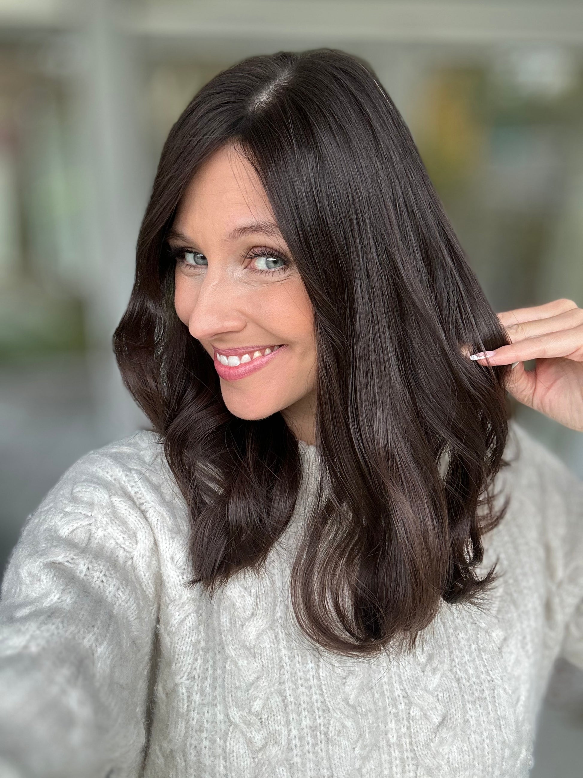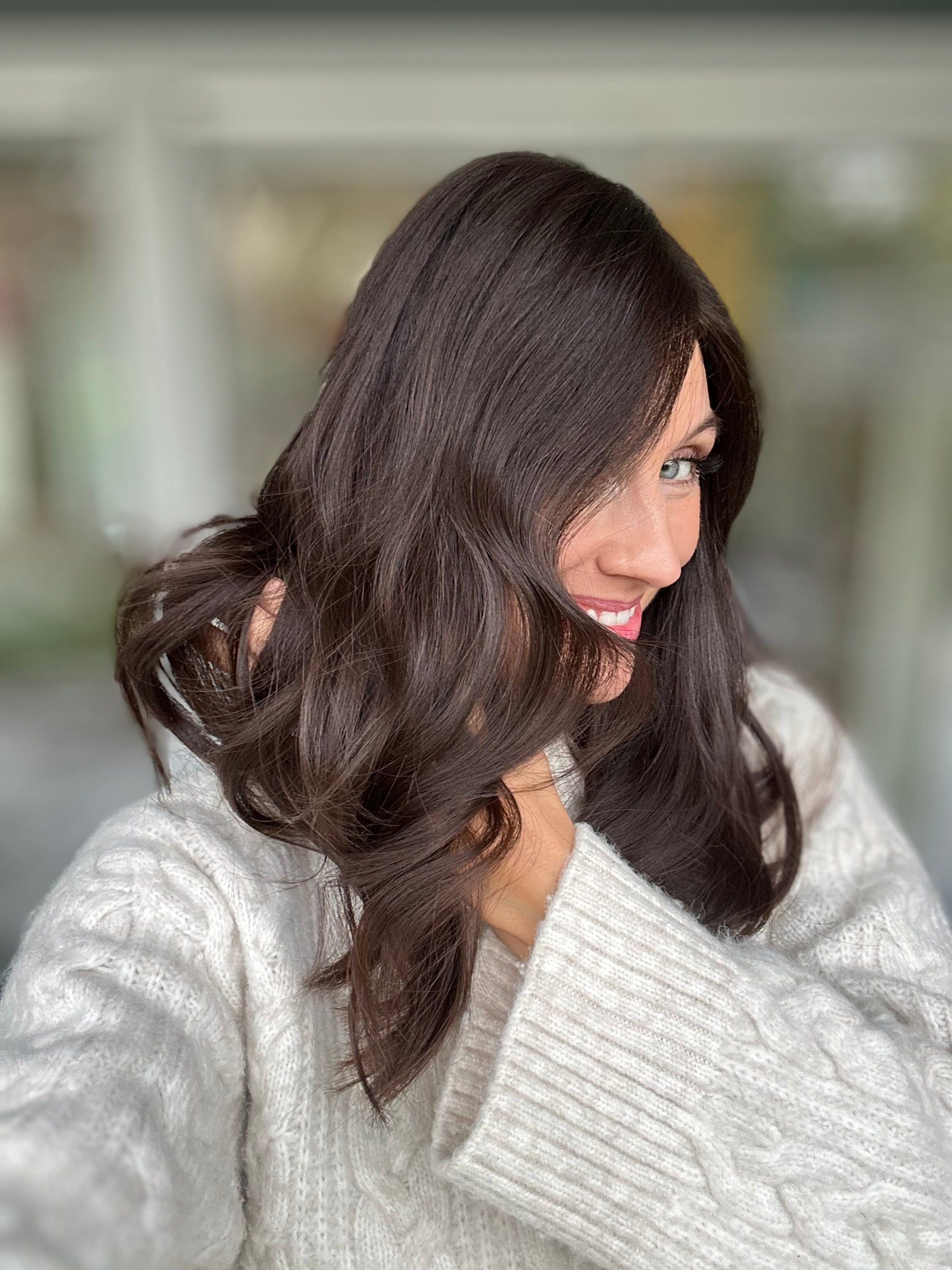 Unsere Evelyn sorgt mit Ihrem warmen dunkelbraun für ein warmes Gefühl im Herz. Der schöne unbearbeitete Naturton kann auf Wunsch mit Strähnen, ombre oder Face Framing versehen werden.