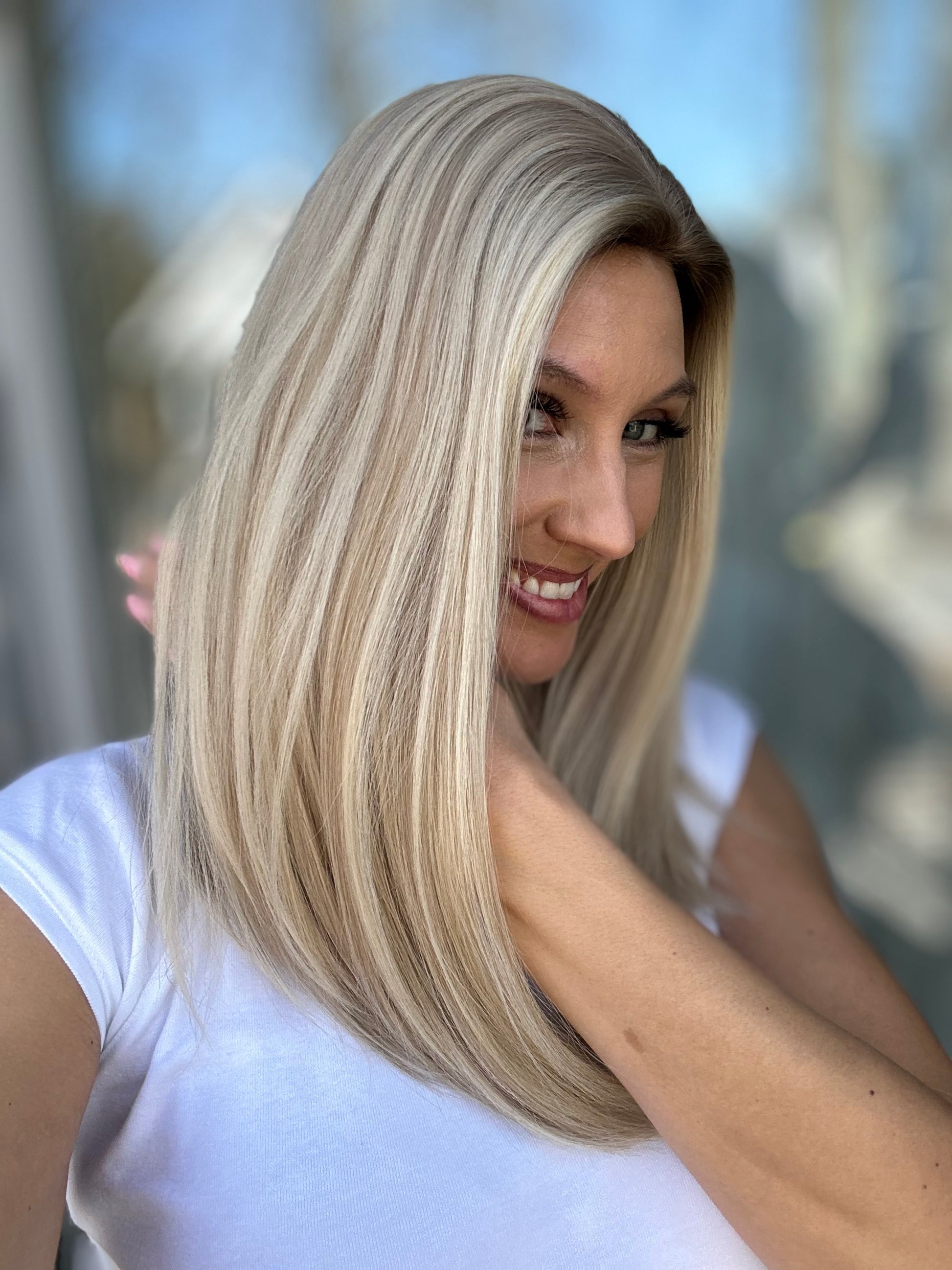 Ein raffinierter Look mit einem aschigen Ansatz und hellblonden aschgesträhnten Längen, der für eine zeitlose Eleganz steht. Der aschige Ansatz verleiht dem Haar eine natürliche Tiefe, während die Längen für ein aschig kühles strahlen und Lebendigkeit sorgen.