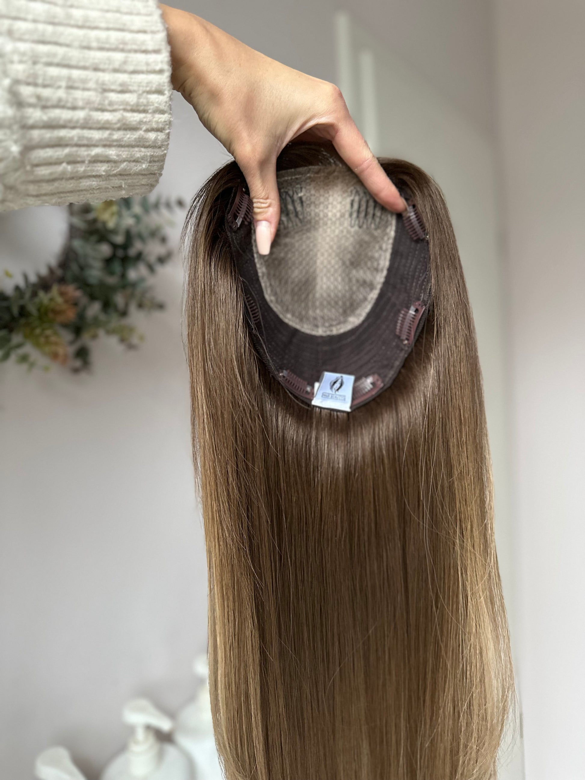 Die 20x20cm Montur ist eine mittelgroße Standartmontur und bedeckt bereits einen Großteil vom Oberkopf. 10x10cm sind frei scheitelbar. Um zu überprüfen, wo der Topper auf deinem Kopf Exakt sitzen wird, empfehlen wir dir, dies vor kauf mit einem flexiblen Maßband nachzumessen. Die Innenseite der Montur ist mit einem breiten Kamm am Haaransatz sowie 6 super weichen Clips versehen und lässt sich innerhalb von Sekunden mit nur 3 Fingern öffnen und schließen.