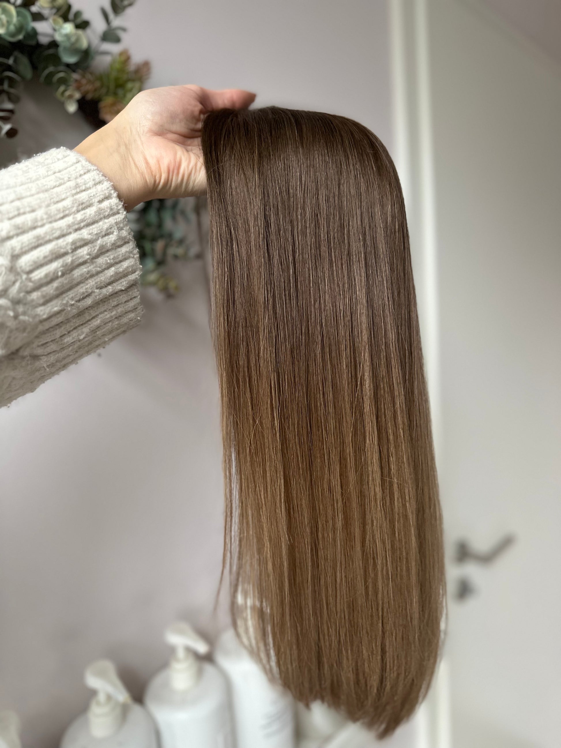 Unglaublich schöne Sommerfarbe. Arschiges mittelbraun welches in blonde Ombré Längen verläuft, perfekt für den Sonmer!