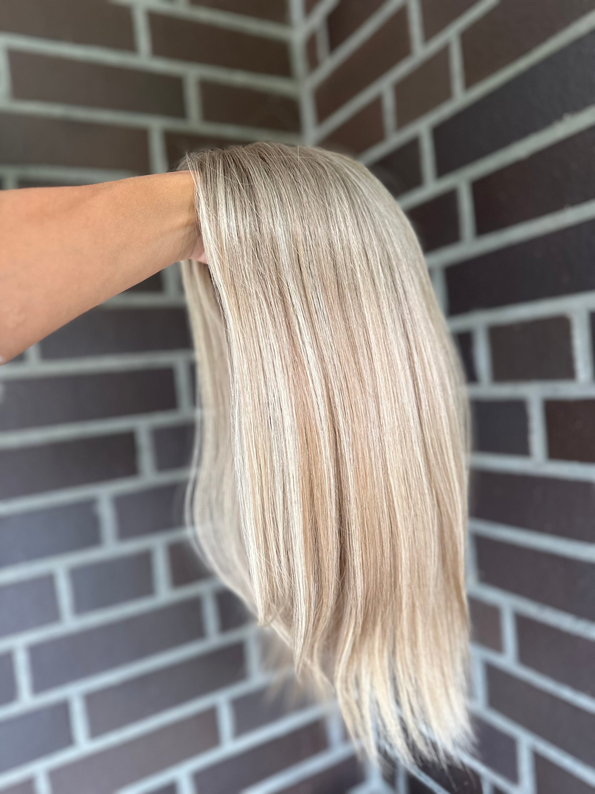 Ein raffinierter Look mit einem leichten Ansatz und Goldblonden Längen mit lowlights, der für eine zeitlose Eleganz steht. Der leichte Ansatz verleiht dem Haar eine natürliche Tiefe, während die warmen Längen für strahlende Helligkeit und Lebendigkeit sorgen.