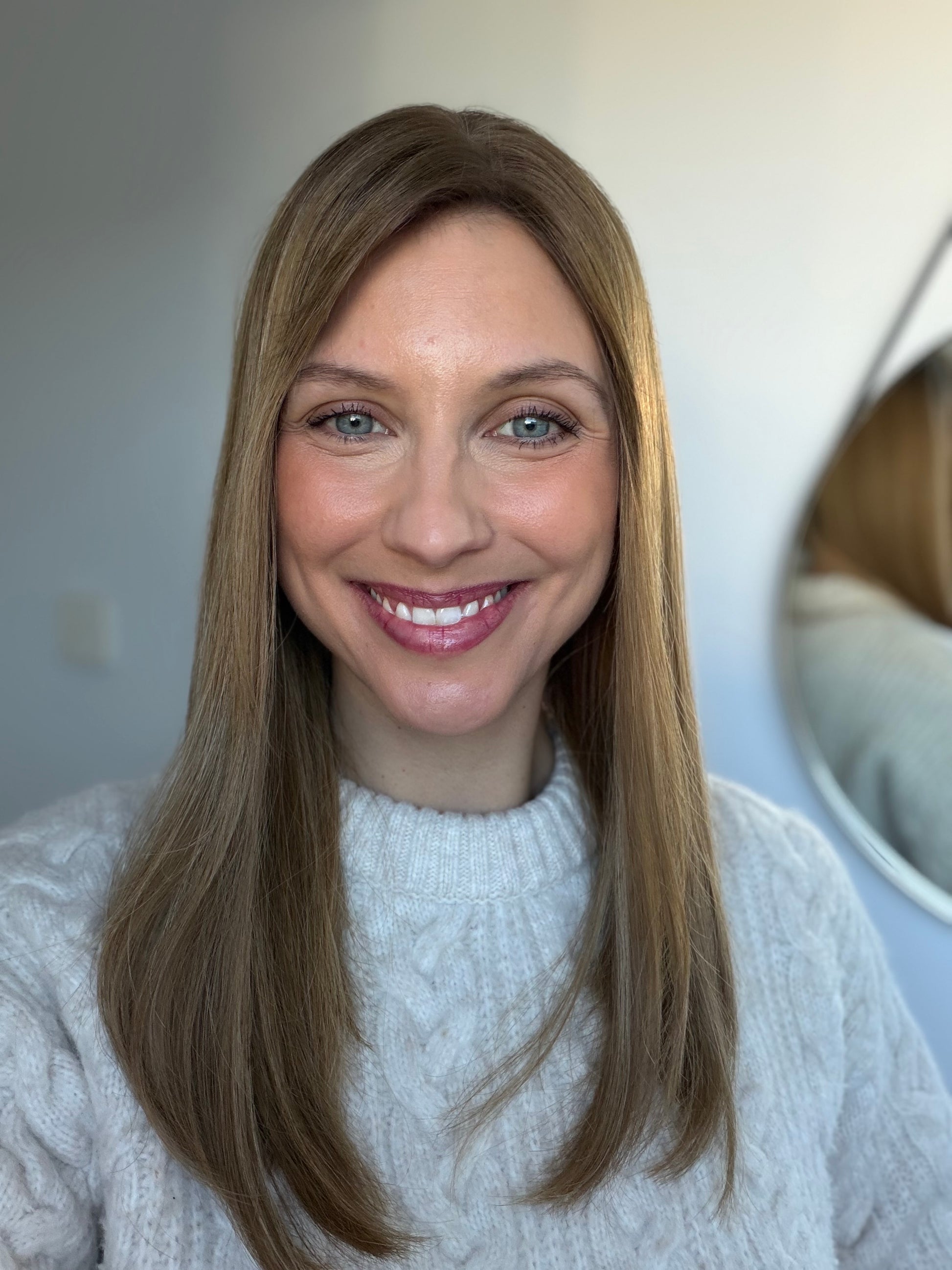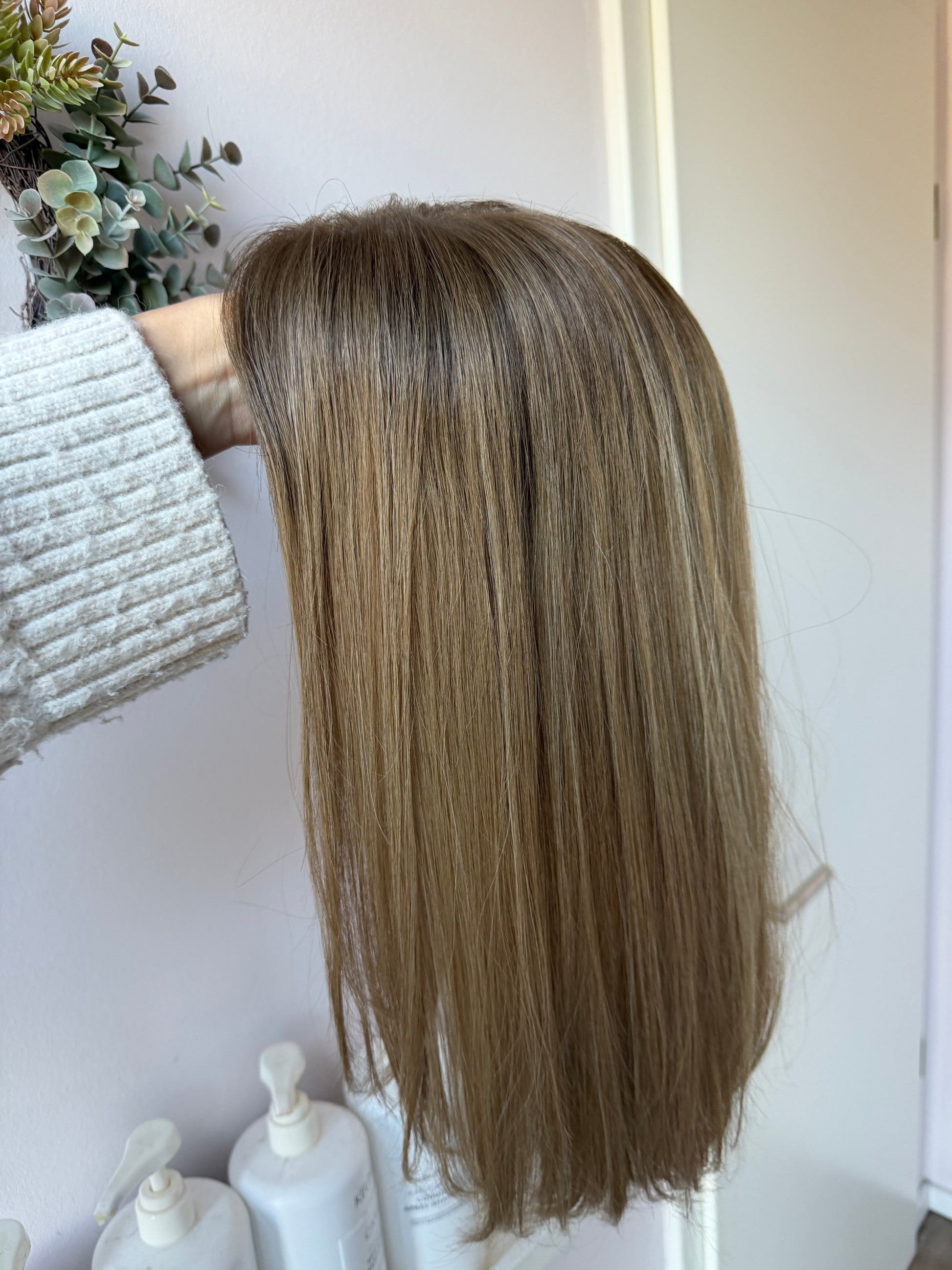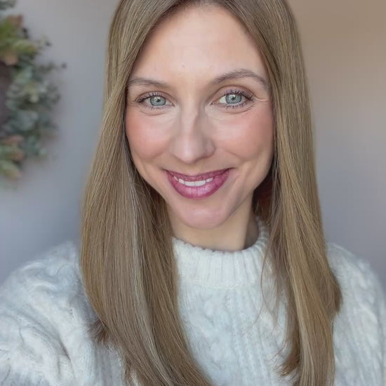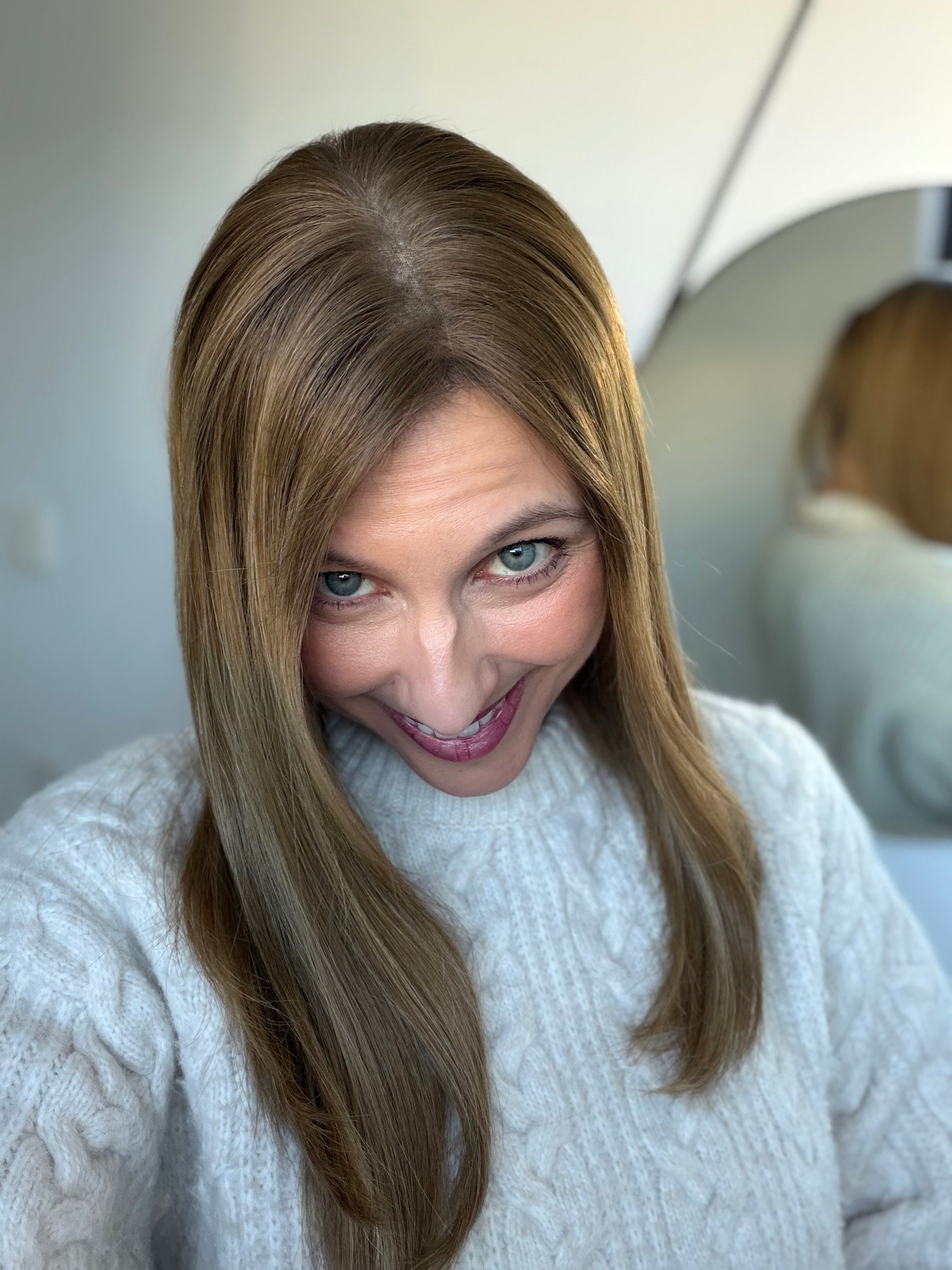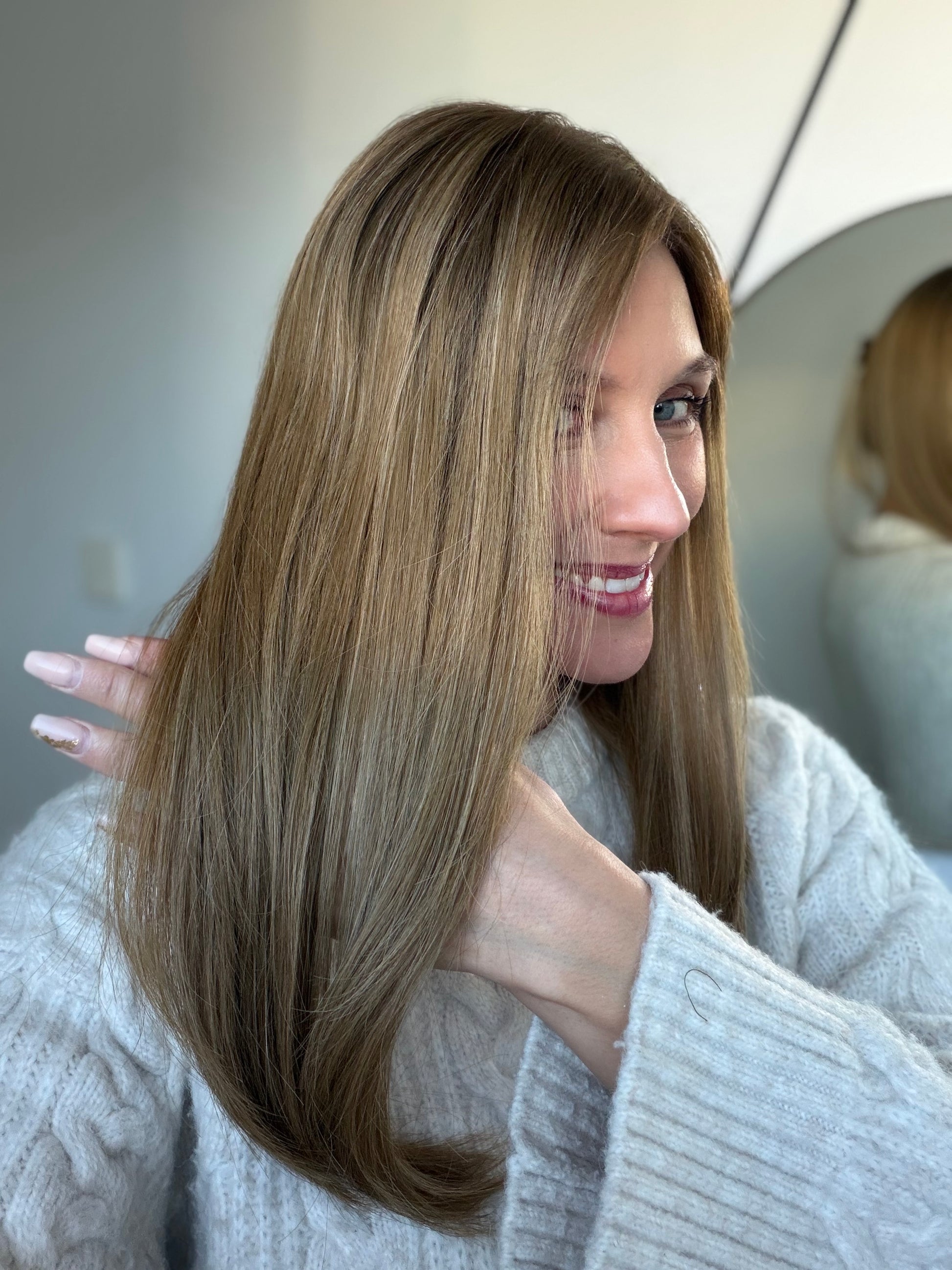 Harmonisches Naturblond im Bereich Mittel- bis Dunkelblond, das in den Längen heller wird und durch mehrfarbige, feine Nuancierungen besonders natürlich und hochwertig wirkt.