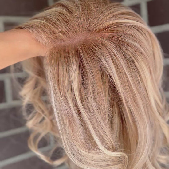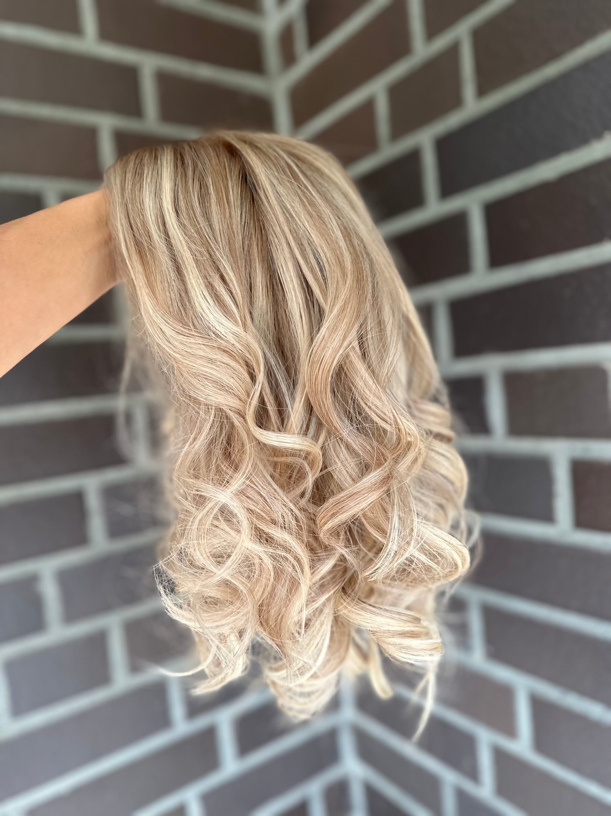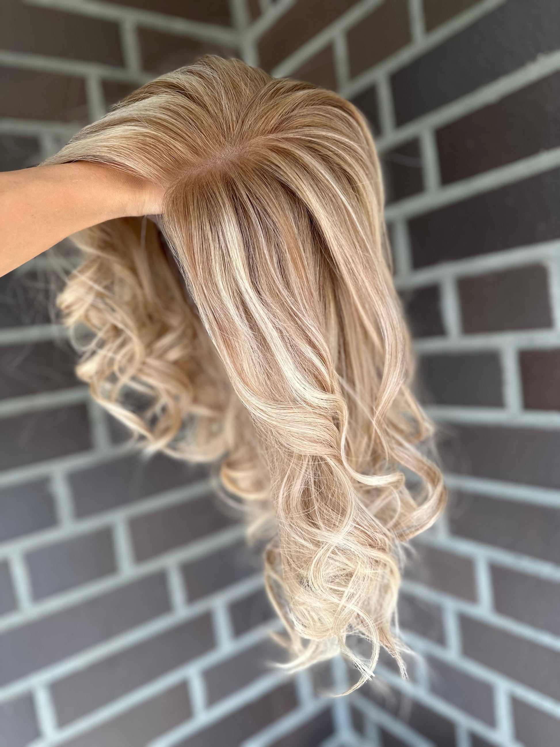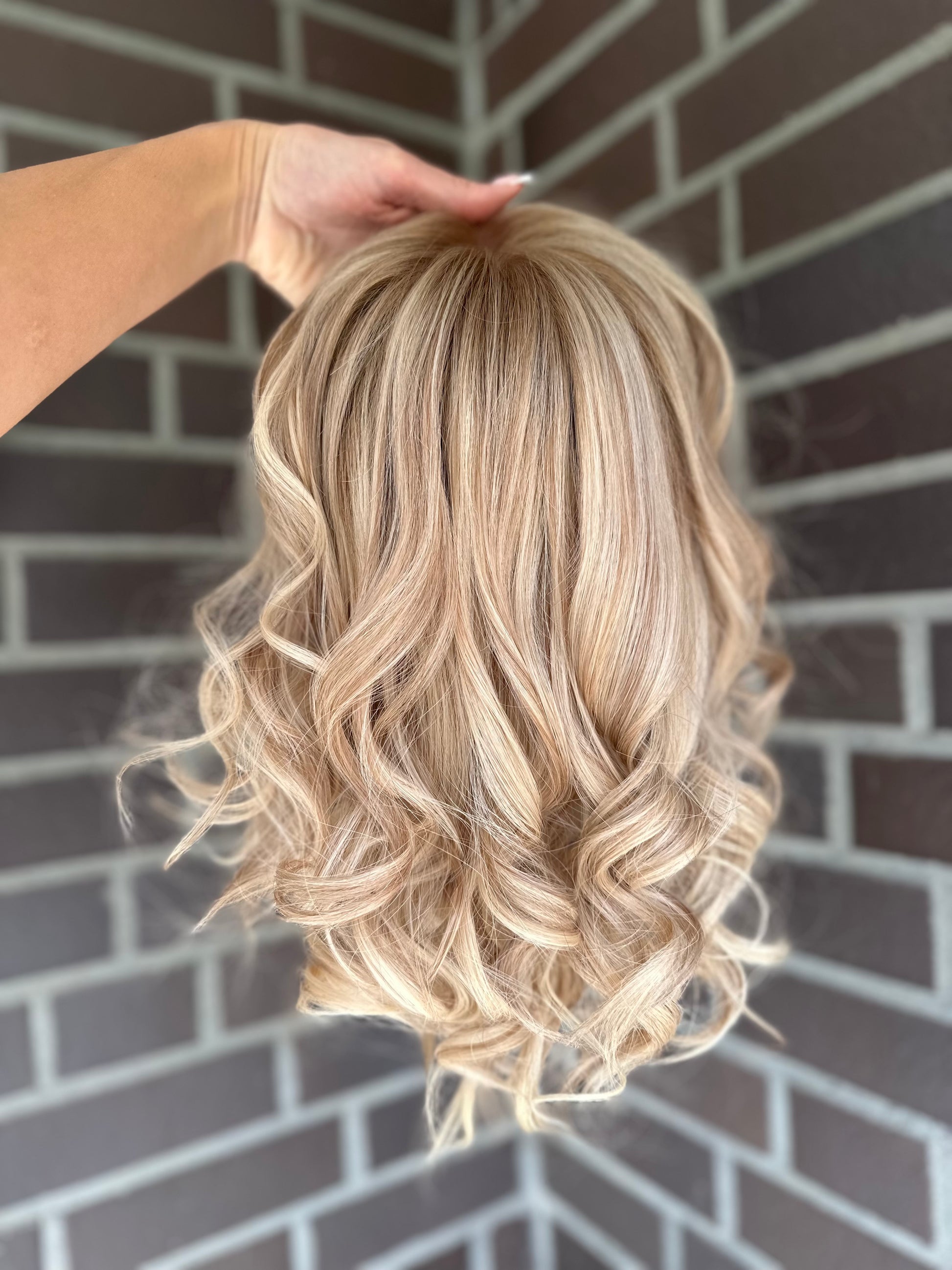 Dieses Unikat besticht durch seinen warm mittelblonden Ansatz, der sanft in hellblond gesträhnte Längen übergeht.