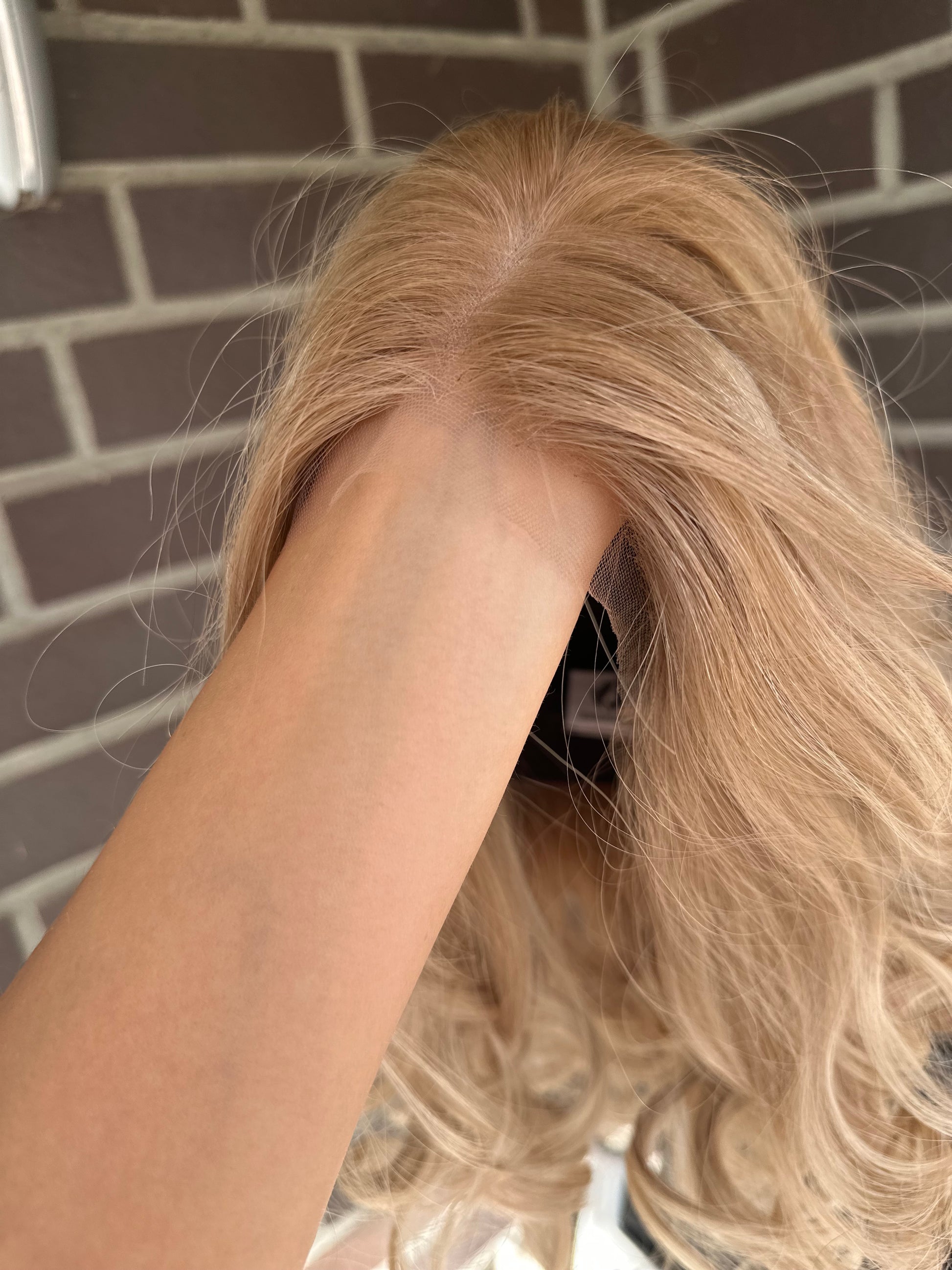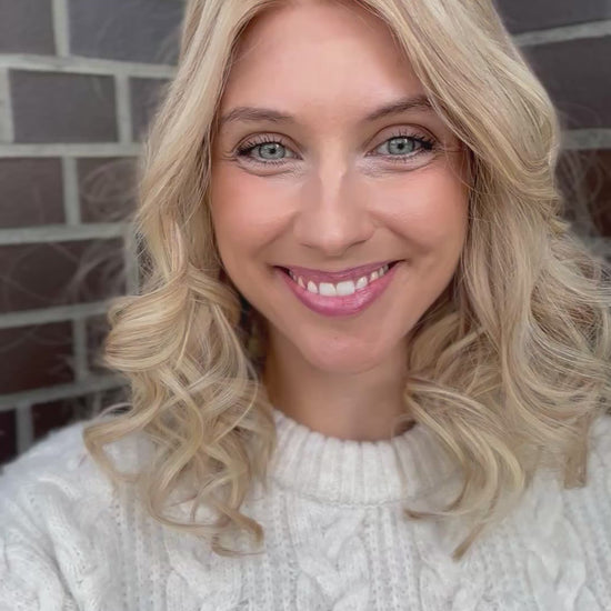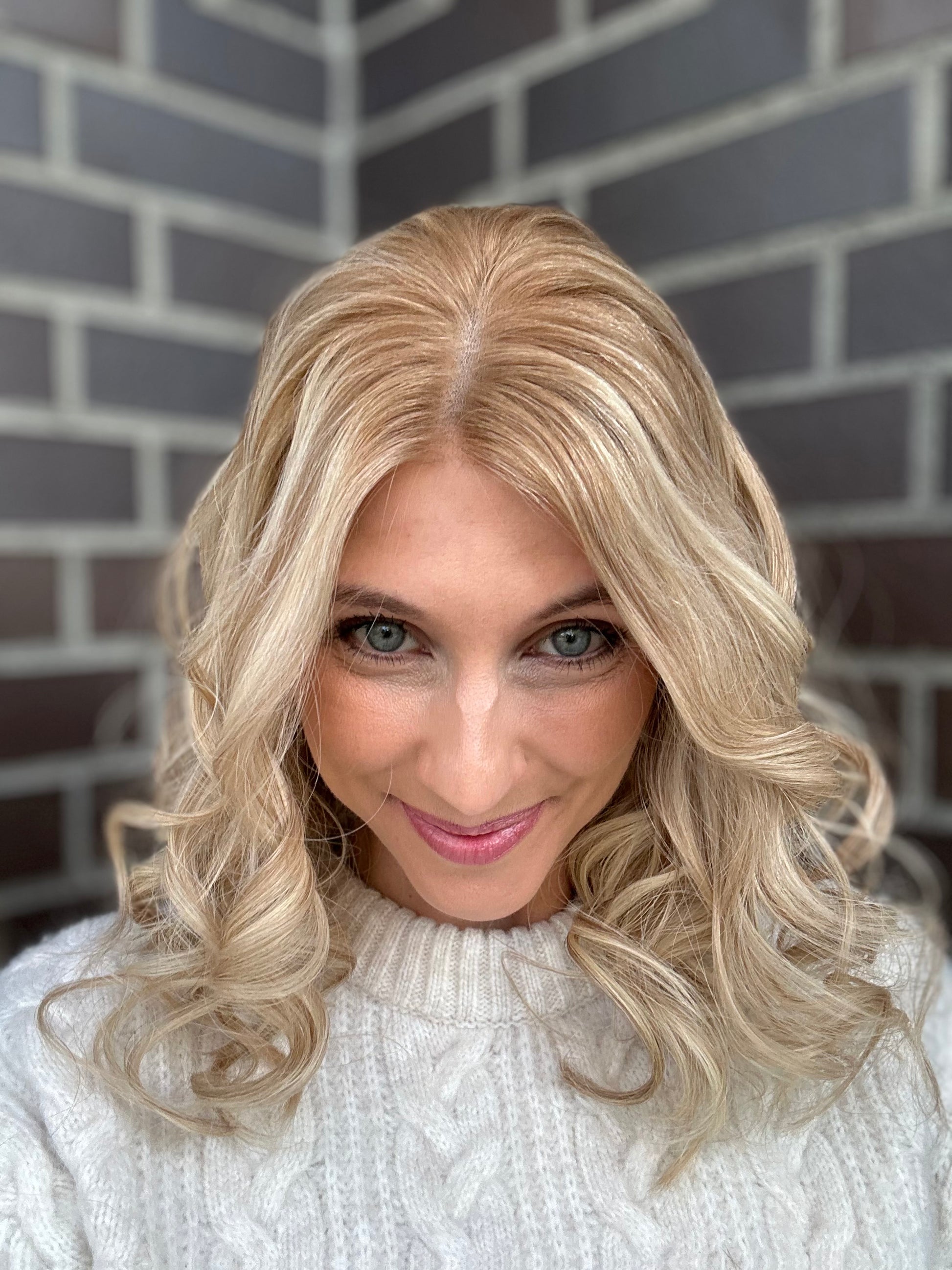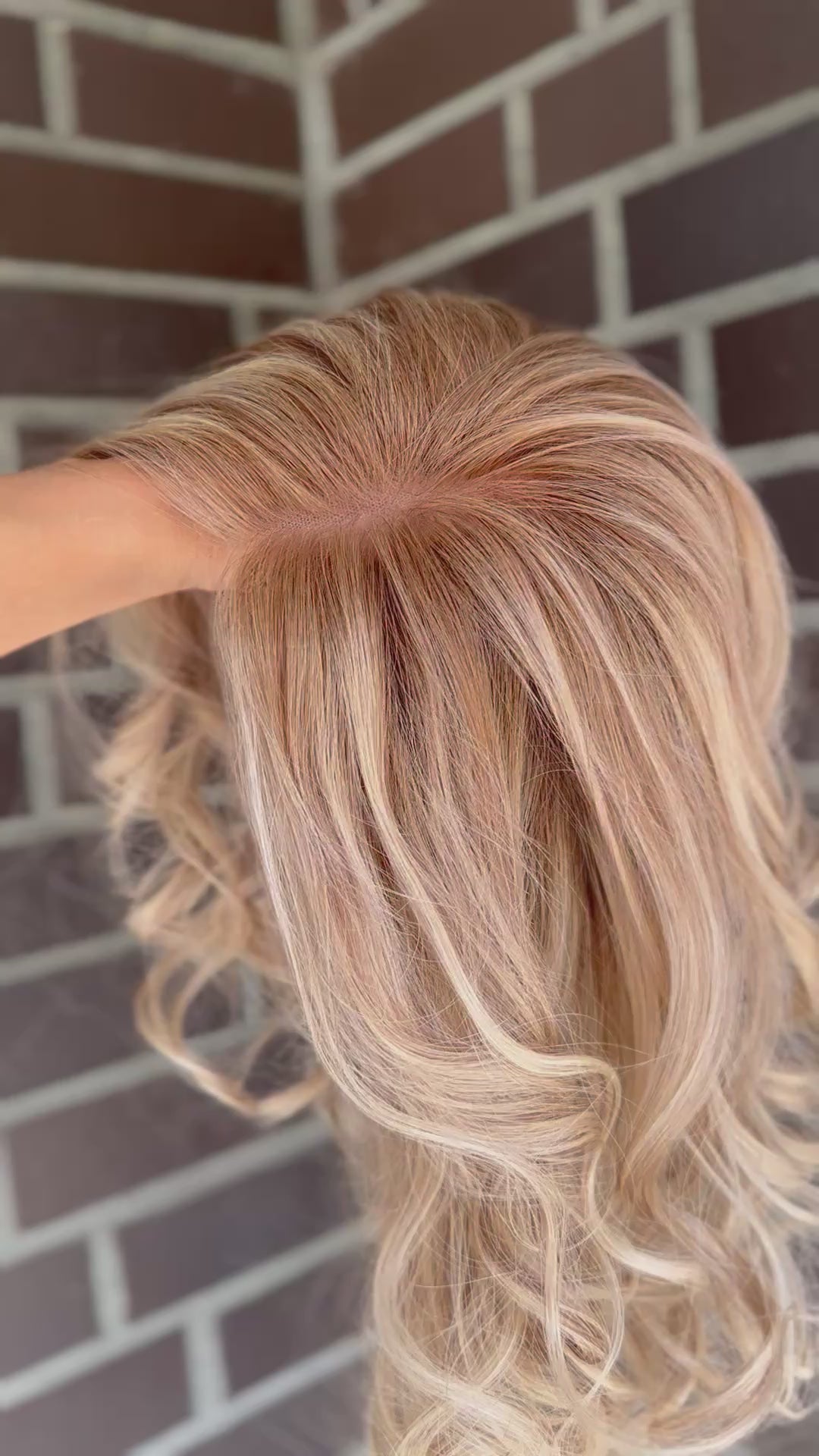 Dieses Unikat besticht durch seinen warm mittelblonden Ansatz, der sanft in hellblond gesträhnte Längen übergeht.