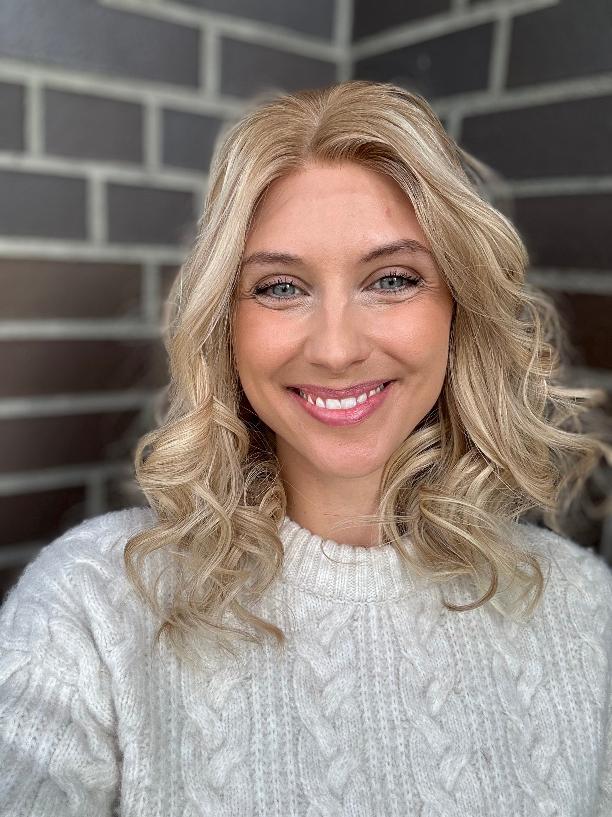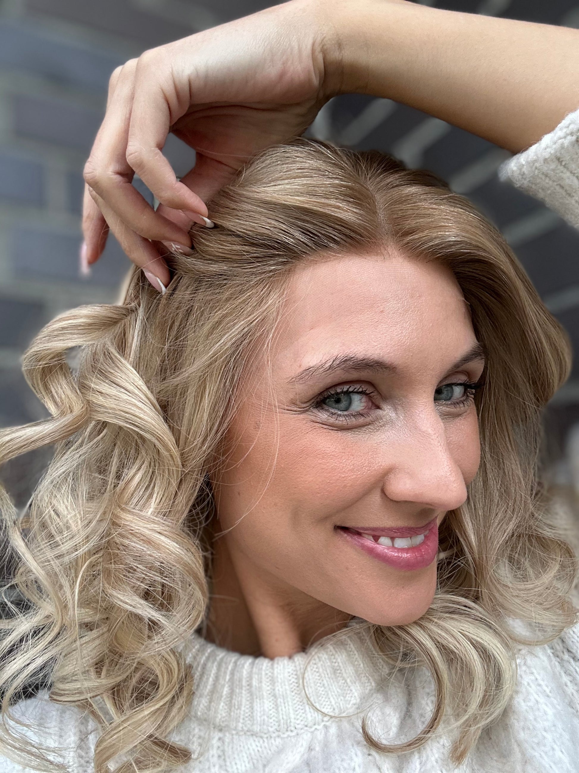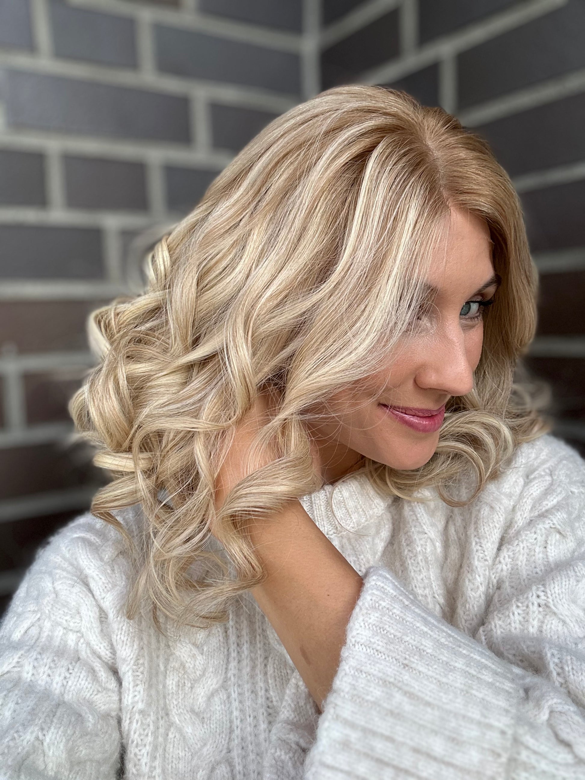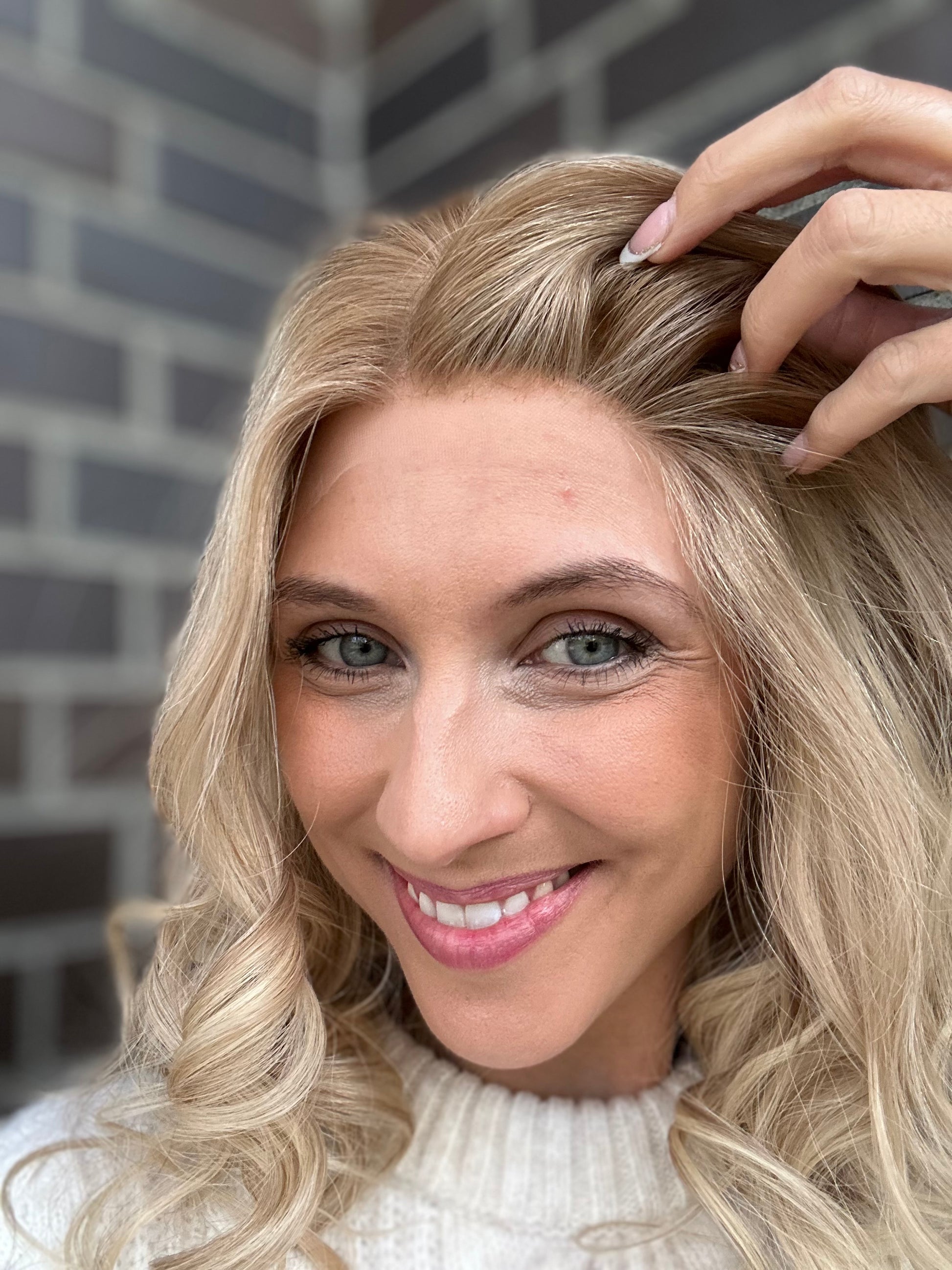 Dieses Unikat besticht durch seinen warm mittelblonden Ansatz, der sanft in hellblond gesträhnte Längen übergeht.