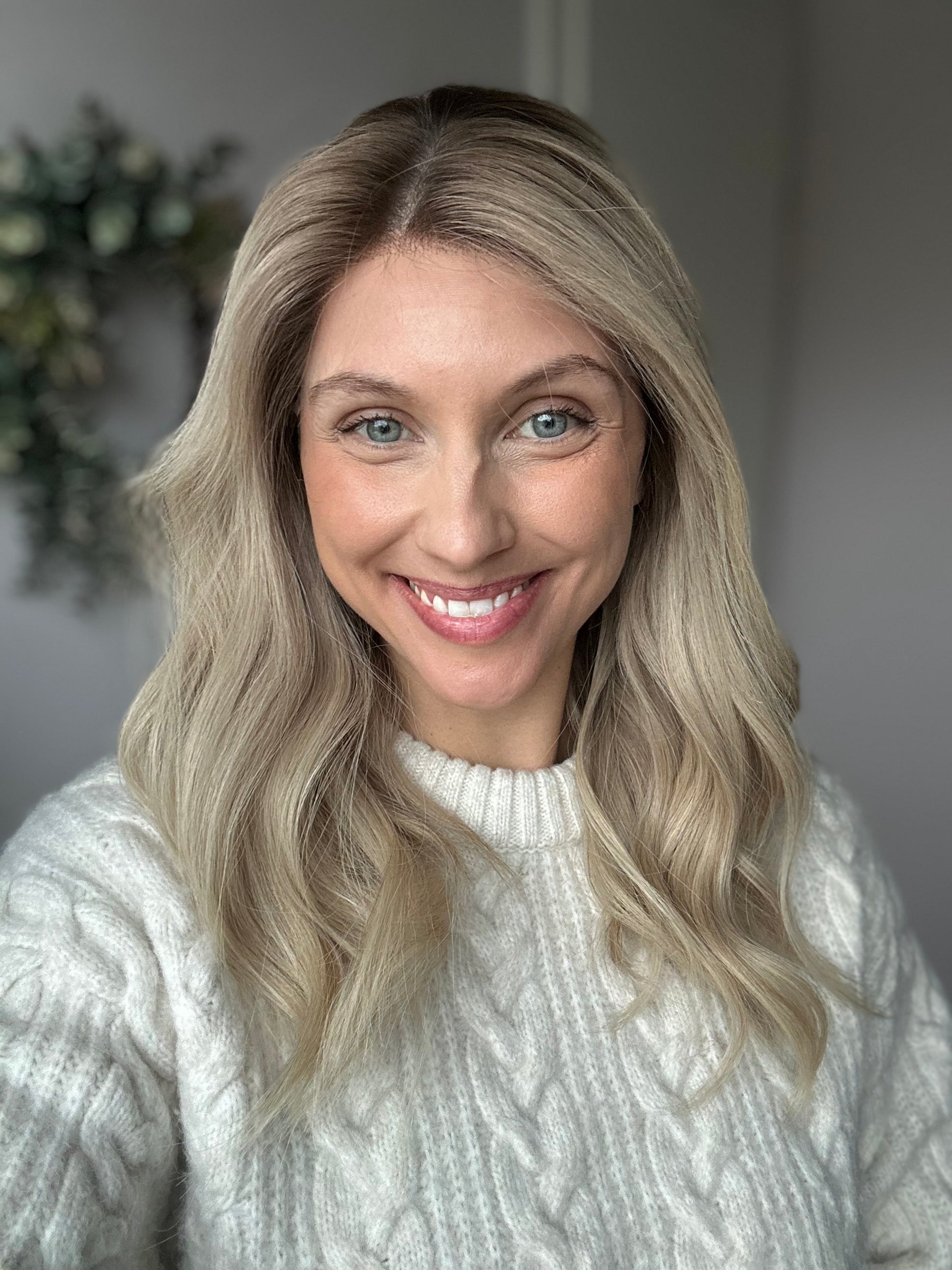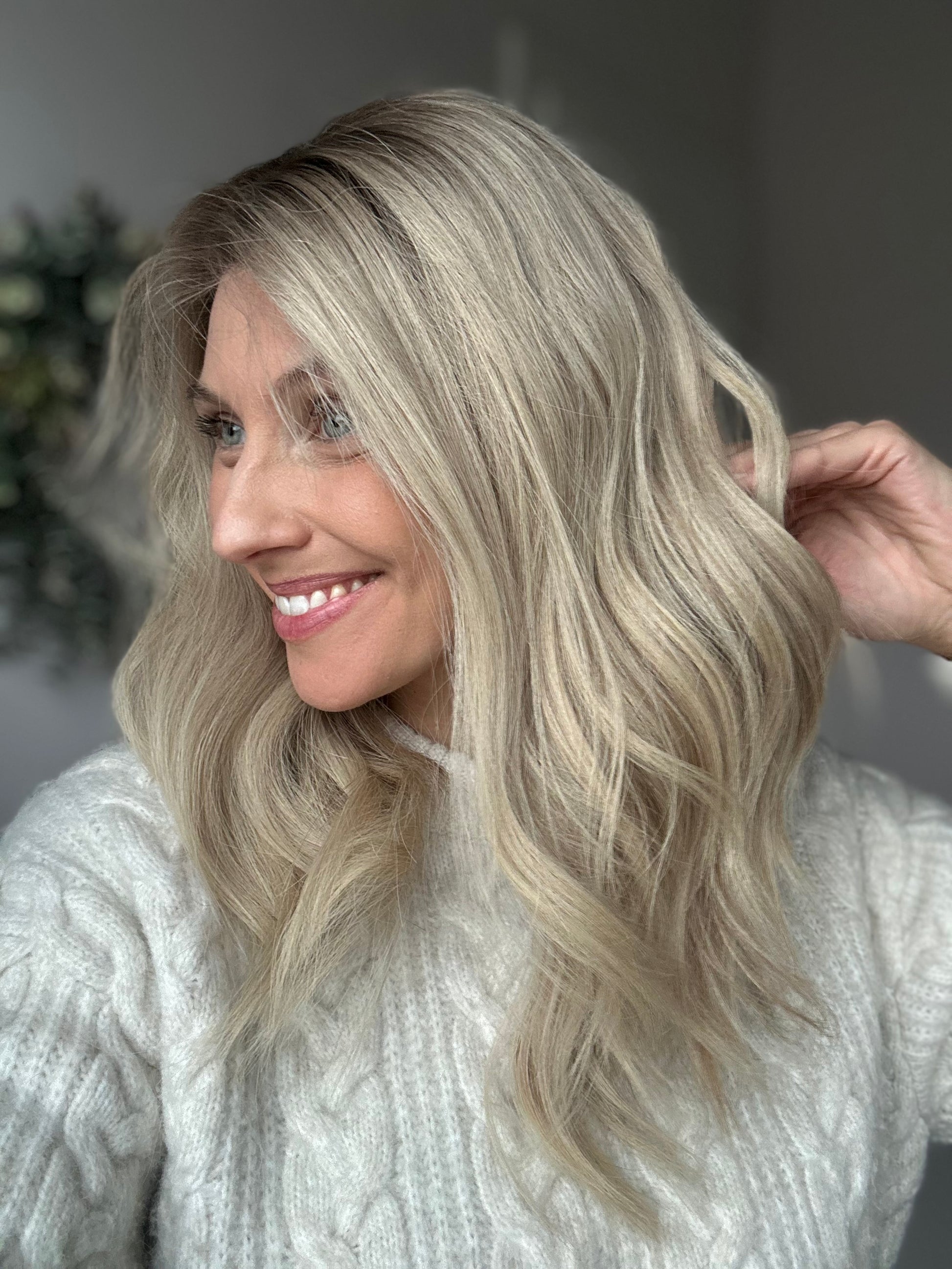 Aschbrauner Ansatz mit einem fließenden Übergang in klare, kühle Blondlängen.