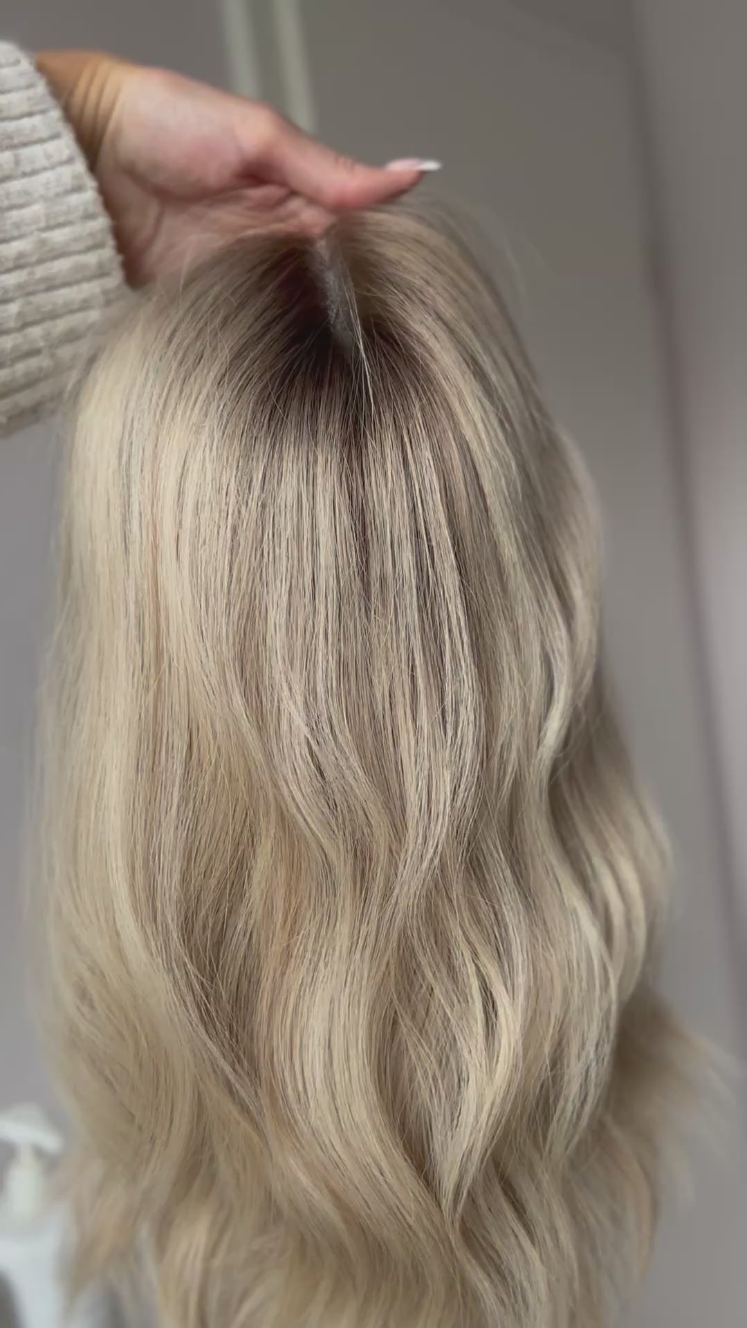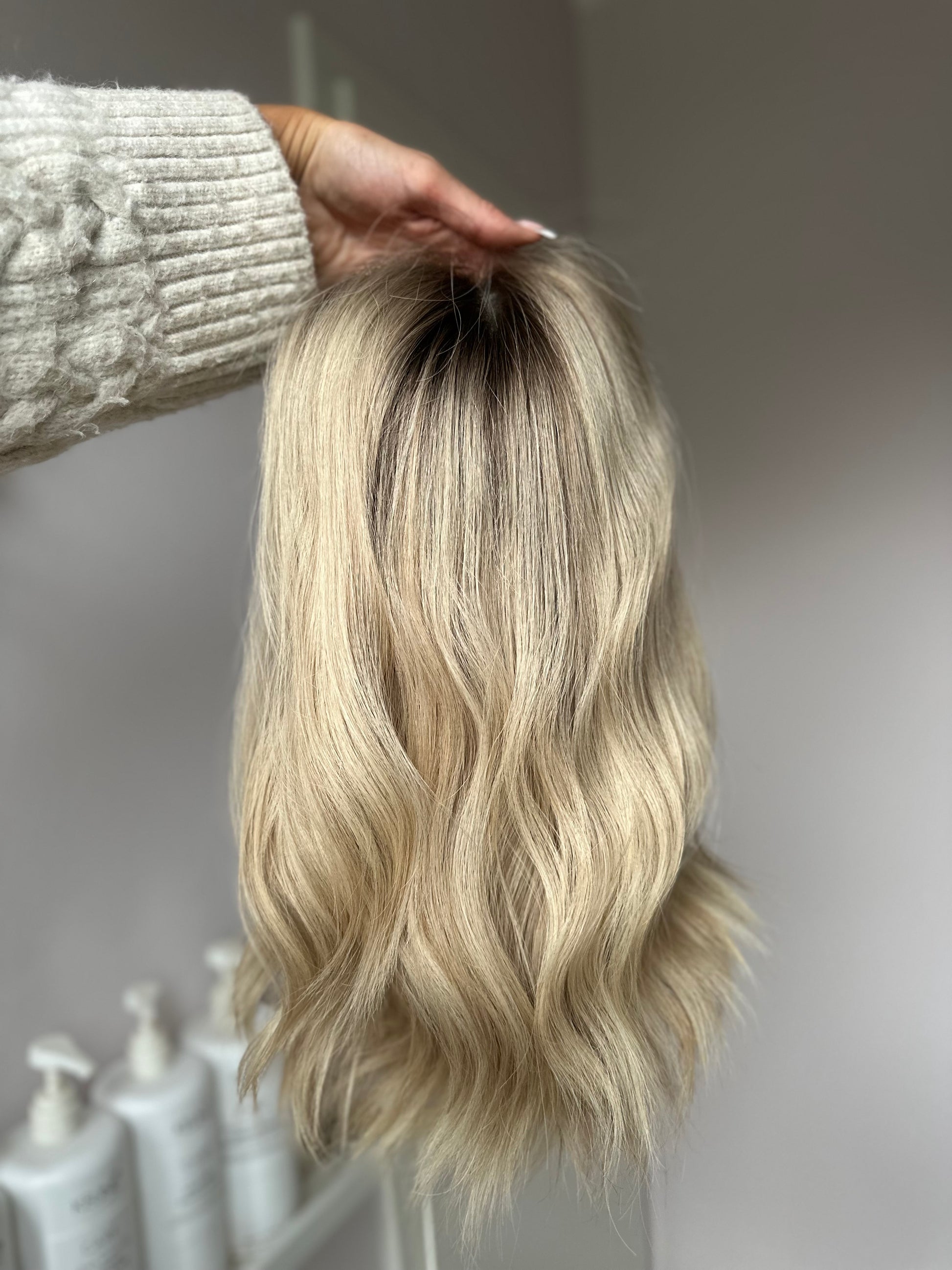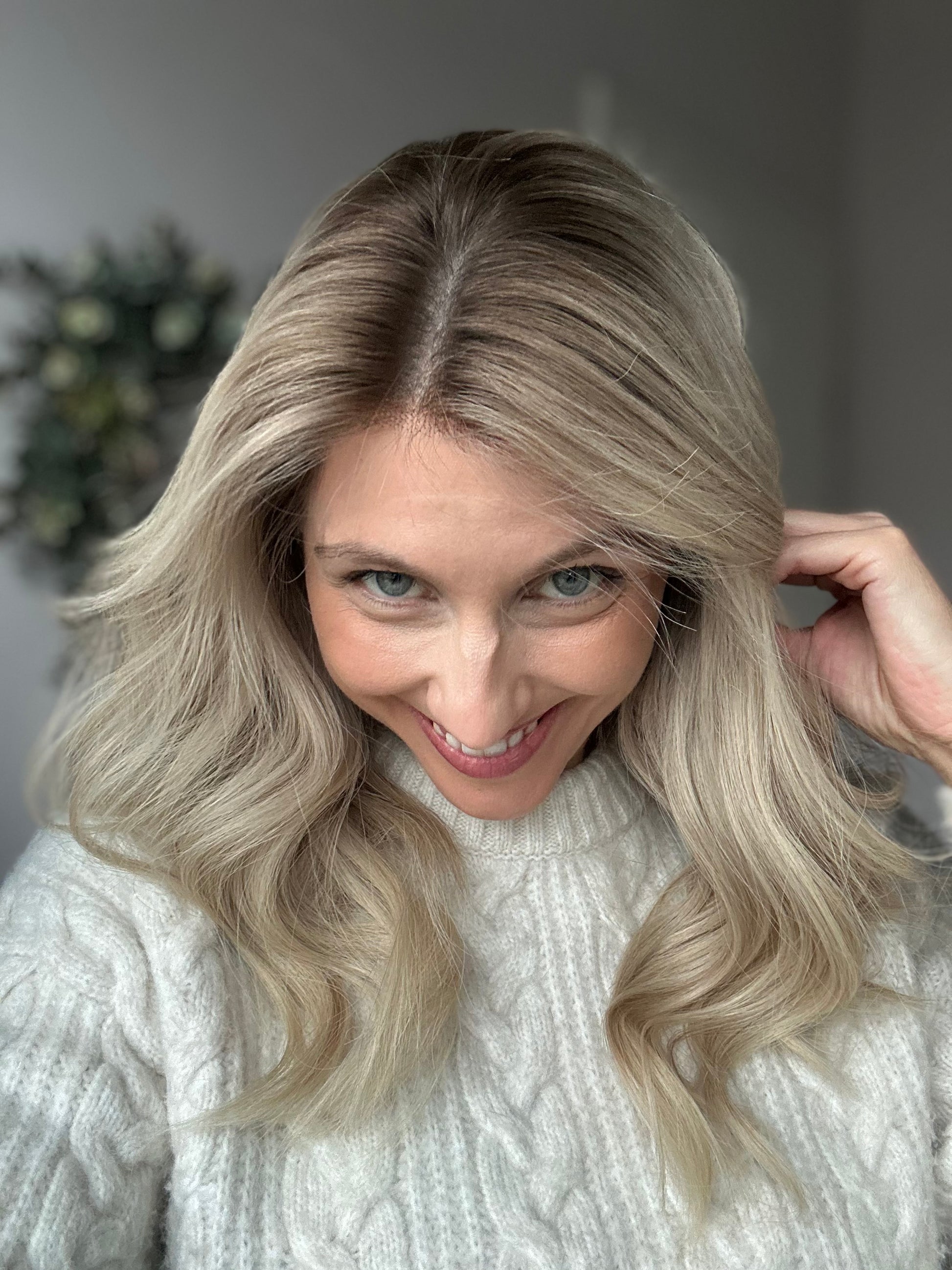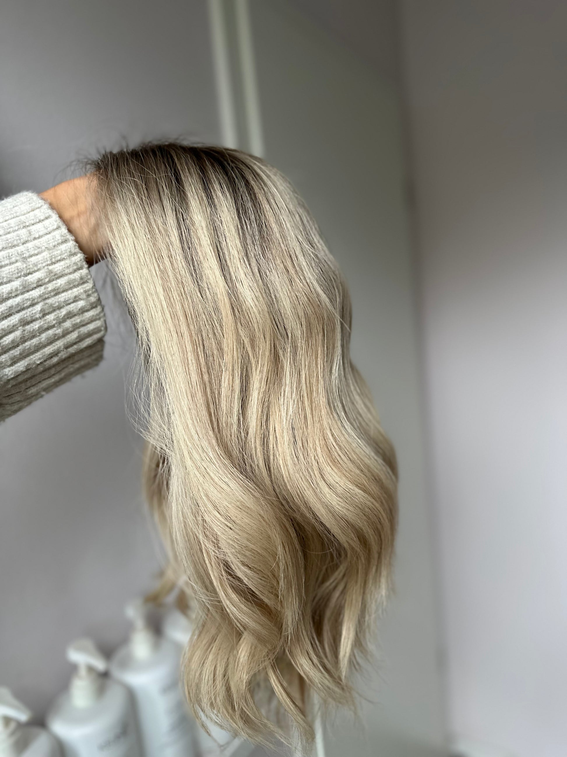 • Aschig brauner Ansatz in kühle hellblonde Längen
